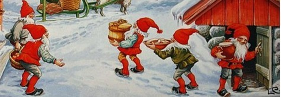Så ser jag min farmor gå in i sovrummet. På sängen står en stor resväska som hon håller på att packa ner i. Det verkar som att avfärden till Tomten är ganska omgående. Jag dricker lite av den goda julmusten och frågar min farmor. ”När är det tänkt att du ska resa till Tomten?” ”Lille Fredrik”, säger min farmor som att hon glömt att jag är 42 år och väger över 100 kilo, ”jag reser iväg under kvällen. Det kommer en nisse och hämtar mig vilken minut som helst. Du får ta hand om mitt hem när jag är borta. Säg till din mamma att jag kommer hem till familjens julfirande först annandag jul. Som du ser tänkte jag duka fram lite julstämning för dig innan jag åker. Så ta för dig av alla gottar” Farmor hinner inte mer än lägga det sista i resväskan innan det ringer på dörren. ”Fredrik, gå och öppna, det är nog en nisse som kommer och hämtar mig” Jag öppnar dörren och utanför står det en nisse som hämtad ur en julsaga man läste som liten.
