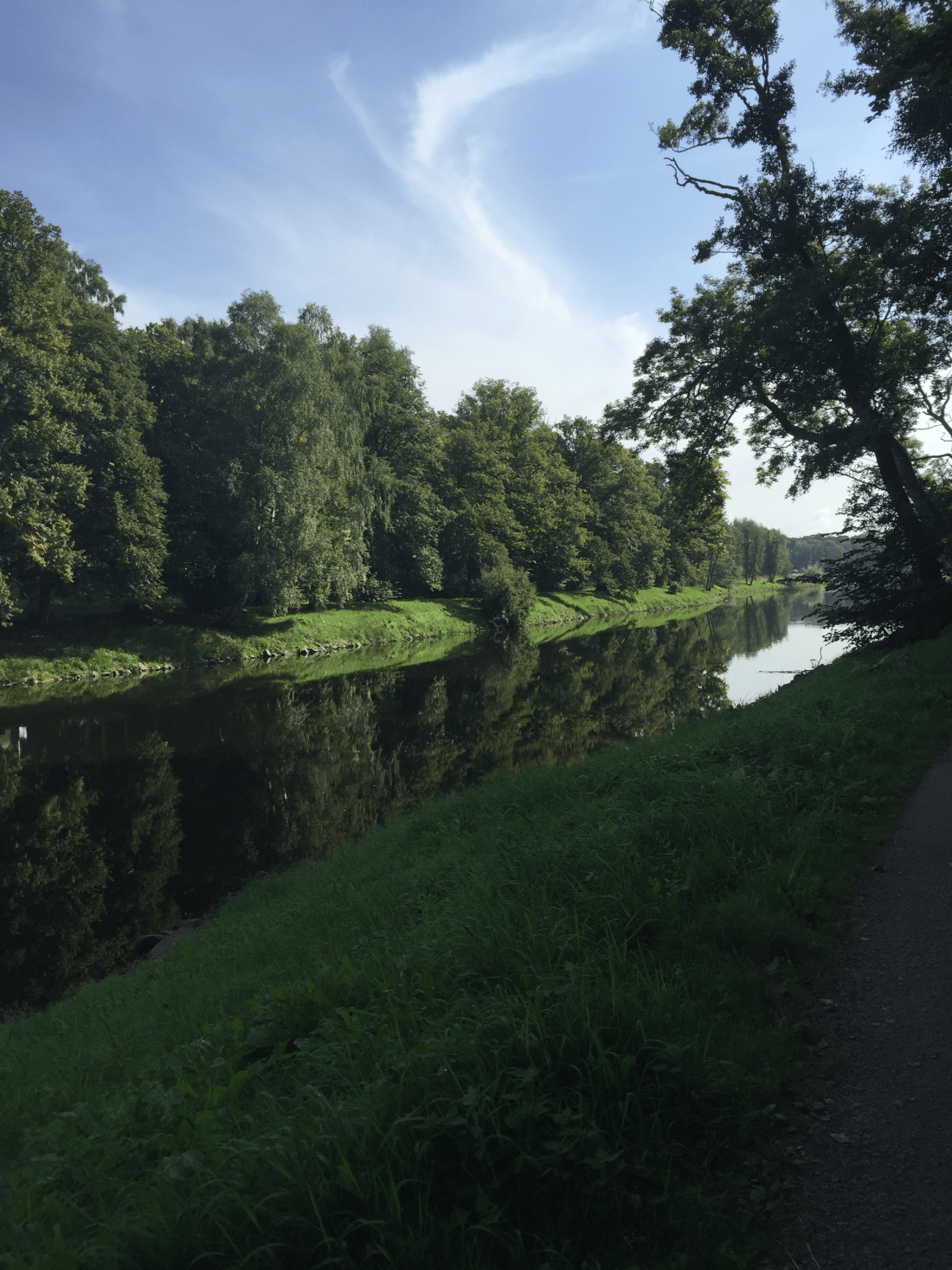 Jag strosar så sakteliga längs ängens ljuva flora för att så möta stigen. Väl på stigen av grus skymtar jag ån. Så fortsätter färden på stigen längs ån. Tills jag möter en bänk. Det liknar ingen vanlig gråpatinerad parkbänk, mer en mörk teakbänk, nyligen utsatt, som inbjudande möter mig till en sittning. Väl sittandes kan jag blicka ut över ån.