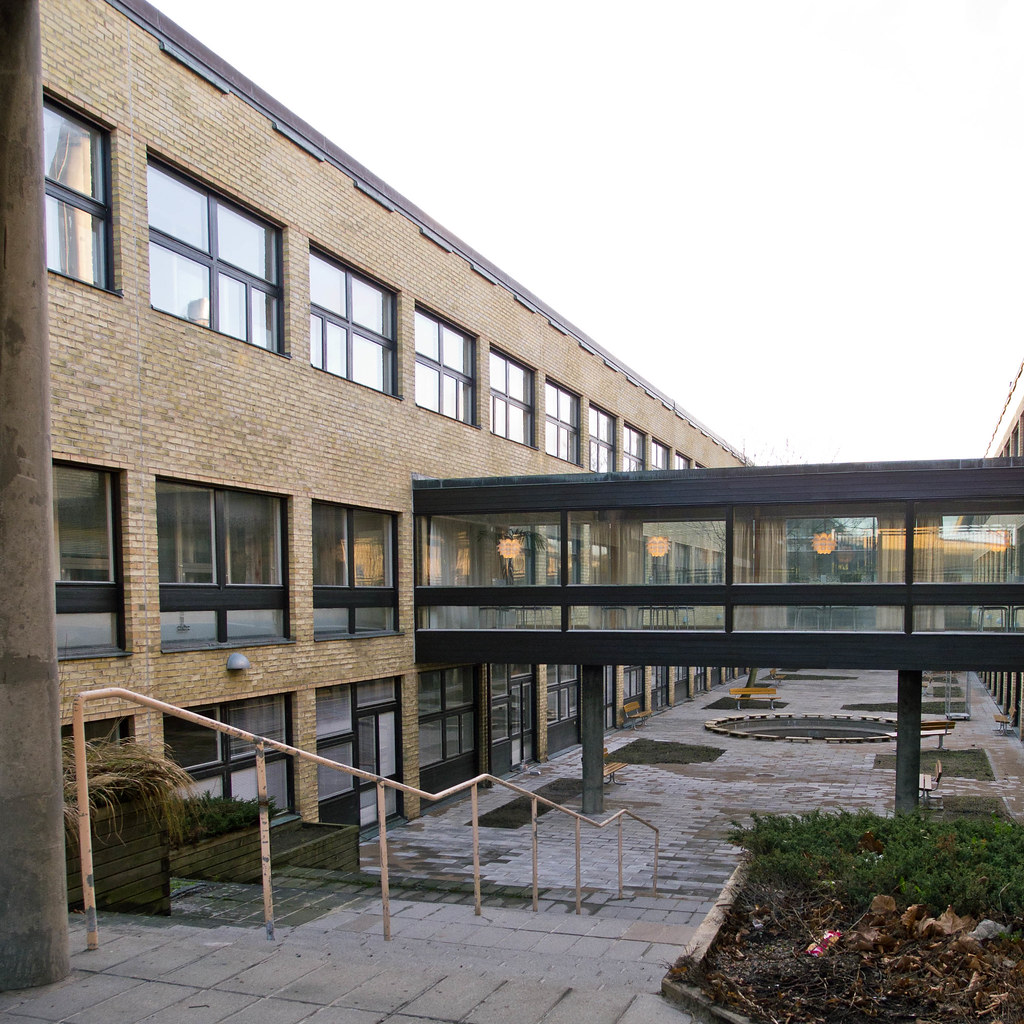 Vi kom in till skolan gick in genom entrén, sen väntade en stor bred trappa upp till andra våningen. Från den gick man via en övergång (ovan ”stenparken”) för att komma till byggnaden där matsalen låg.