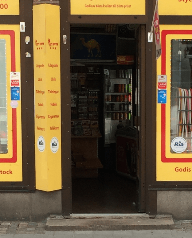 Det var inledningen till besöket med Karim Khalid på Origokiosken i Halmstad klockan 13, en onsdag i början av juli. 30 minuters bilresa för att sen finna en ledig parkering i centrala Halmstad klockan 13 under turistsäsong handlade om tur. Jag hade tur, bara 2 minuters gångväg från parkerad bil till Origokiosken på Origogatan 23 C. Ser strax butiken på 23 C. Reklamflaggor som vajar från fasaden och en GB-clown på marken utanför ingången. En av flaggorna signalerar om ”Moneytransfer”. Själva butikens ingång ser vid första ögonkastet ut som ett stort gult hål i väggen med ett gallrat fönster på varje sida om ”hålet”. Enkelt och tydligt med det generösa öppethållandet stripat i fönstren; Måndag – Torsdag samt söndag 10 – 22. Fredagar – Lördagar längre öppet, 10 – 24. Genom de gallrade fönstren ser jag dunkelt, staplade OLW chipskartonger, en glassfrys och en läskkyl.