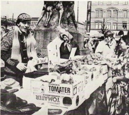 Själv sålde jag som jag berättat i ett annat inlägg sekunda frukt och grönsaker utvalda av min chef Kronvall som därför i folkmun kallades ”Kronmull”. Kvalitén var sekunda men priset var lågt. För de familjer som gjorde storkok med grytor, gratänger eller eget vin var våra sekunda varor ett bra köp. Min plats på torget bestod av två bord där jag la upp mina primörer. Tomatkungen som var framför mig hade säkert om jag minns rätt åtta bord eller mer. Fyllda av tomater men även gurkor, potatis och dill.